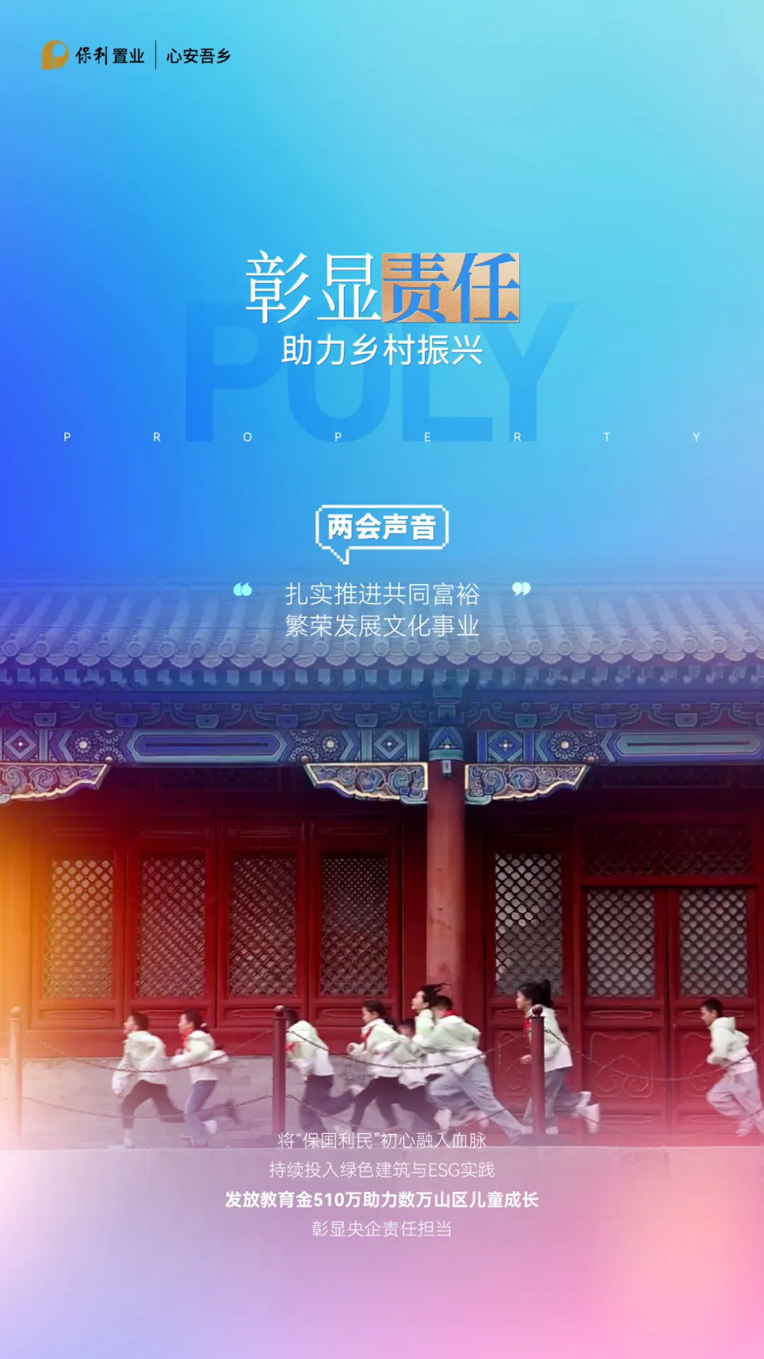 社会责任,是央企高质量发展的必答题。多年来,保利置业坚持投身乡村振兴与公益事业,发放教育金510万元,助力7.6万余名山区儿童逐梦圆梦,增强中国少儿儿童文化自信。同时,保利置业将ESG理念融入经营管理,在绿色建筑、节能减排、生态保护上持续投入,让企业发展每一步都成为美好未来的铺路石。